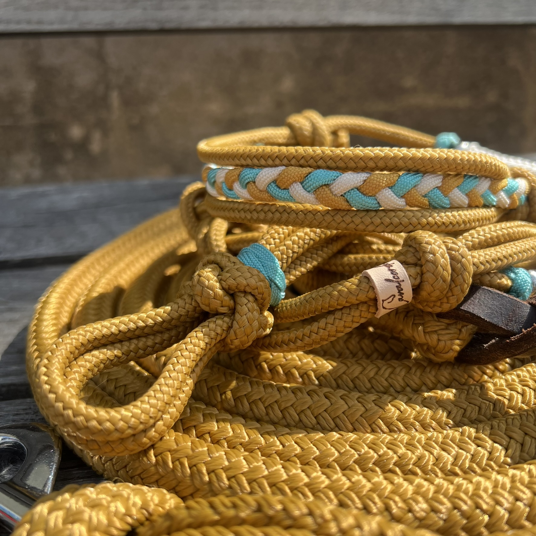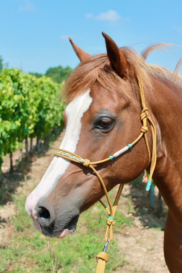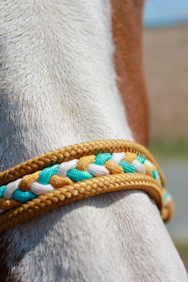Avec ses tons turquoise, caramel et crème, fermez les yeux et sentez vous galopez à traavers les plaines verdoyanyes. La muserolle tressée, les décorations de montants et la finition soignée de la têtière apportent une touche esthétique et un bon ajustement. Le licol est proposé en différentes tailles pour s’adapter à chaque cheval.