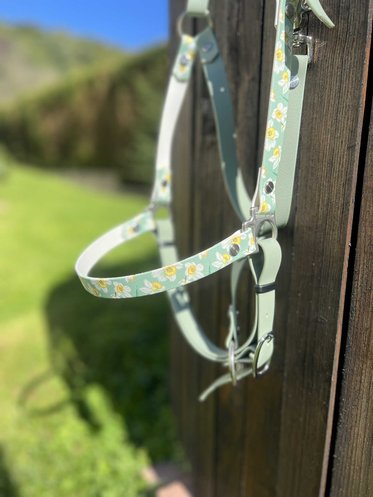 Offrez à votre cheval un licol à la fois élégant, résistant et facile d’entretien grâce à ce modèle « Nature Fleurie » fabriqué en biothane haut de gamme. Ce licol associe un biothane vert grenouille profond à une touche florale grâce à un biothane orné de délicates jonquilles, pour un style frais, doux et naturel. Parfait pour les amoureux de la nature et les balades en pleine campagne.