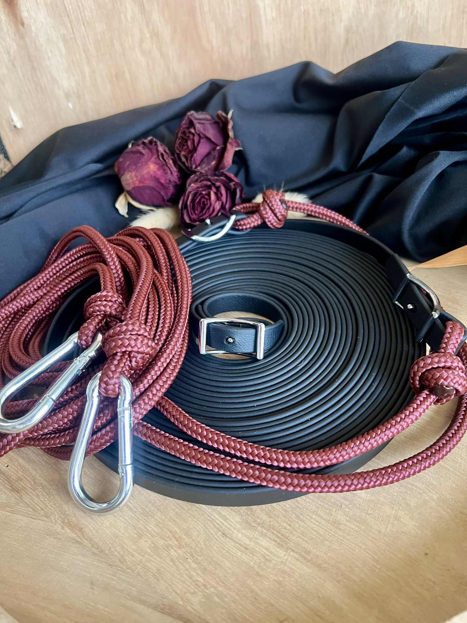 - Dans le cas des longues rênes de 9m vous pouvez acheter une autre pièce de BioThane® et ainsi passer à une paire de longues rênes de presque 14m.